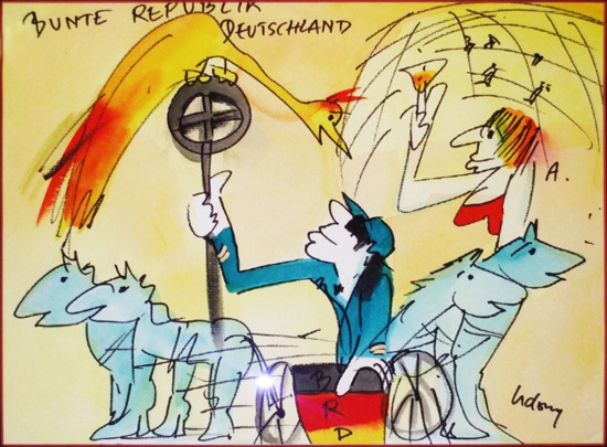 In den 1980er Jahren widmete sich Lindenberg neben seinem musikalischen Schaffen zunehmend dem Thema innerdeutsche Beziehungen. Trotz großer Bemühungen blieb es ihm jedoch verwehrt, mit seinem Panikorchester in der DDR aufzutreten – abgesehen von einem überwachten Auftritt, der 1983 vor ausgewähltem FDJ-Publikum im Ost-Berliner Palast der Republik stattfand. Eine für 1984 bereits geplante Tournee wurde von der Staatsführung der DDR wieder abgesagt. Später kam es zu einem medienwirksamen Austausch von Geschenken, als Lindenberg 1987 Erich Honecker eine Lederjacke schickte, von diesem im Gegenzug eine Schalmei erhielt und Honecker schließlich anlässlich dessen ersten Besuchs in der Bundesrepublik Deutschland eine mit dem Slogan Gitarren statt Knarren beschriftete E-Gitarre überreichte.